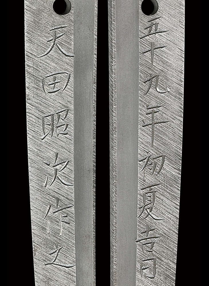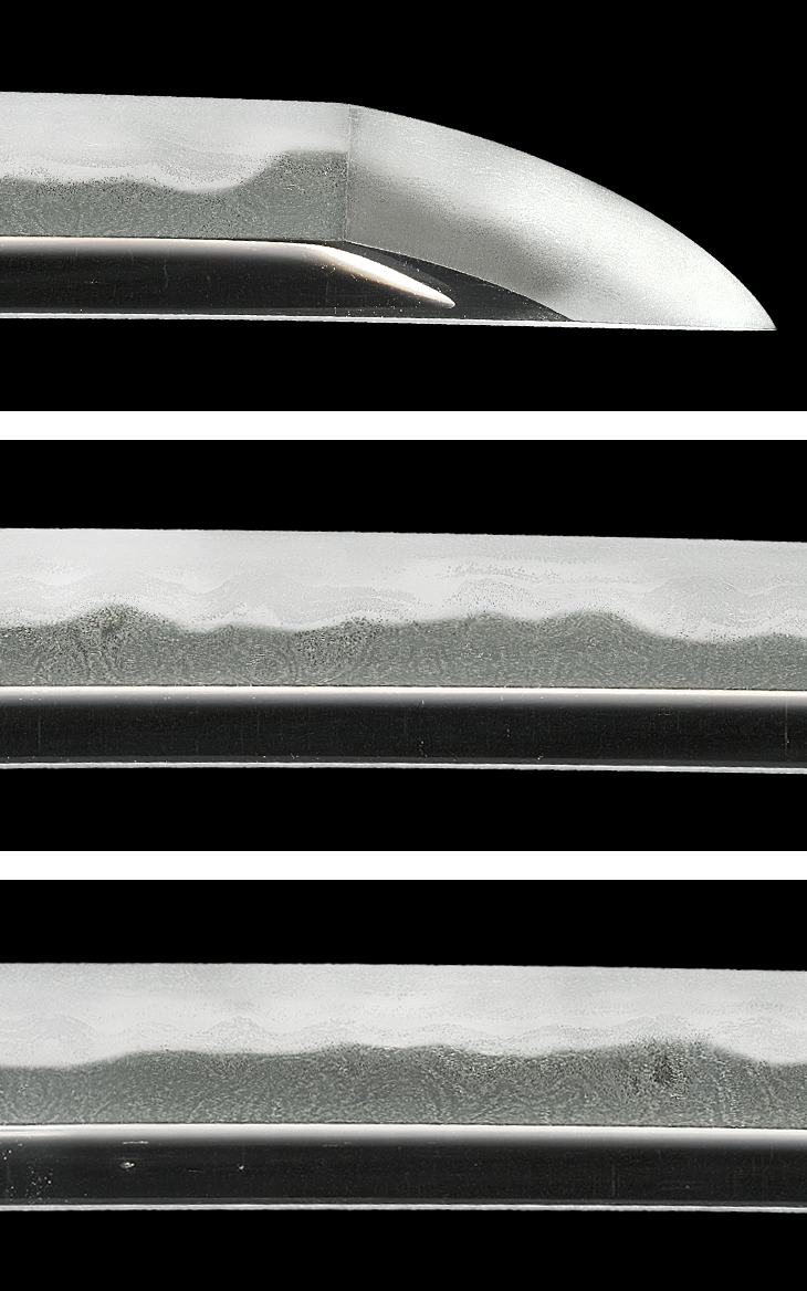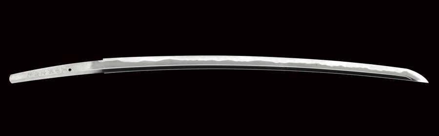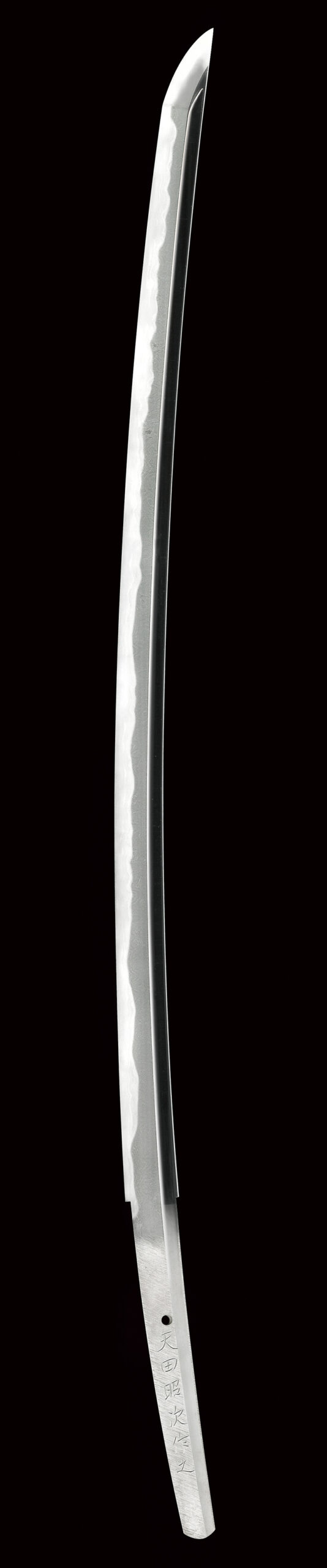 本作は昭和五十九年、同工五十七歳の頃の作、寸法二尺三寸八分、切っ先延び心、元先身幅の差が少なく、豪壮で力感溢れるスタイルは、鎌倉末期から南北朝初期の典型的な太刀の磨り上げ姿を示しています。